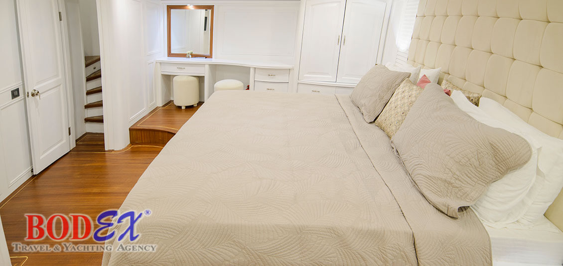..is a 7 star royal - vip gulet built in Marmaris. It is 38 meters long and 8,50 meters wide. On the ship you have 2 Master cabins, 2 Twin bed cabins and 2 Double bed cabins with own toilet and shower. Of course, all cabins are air-conditioned (depending on the ship, the duration of the air-conditioning can change).