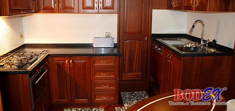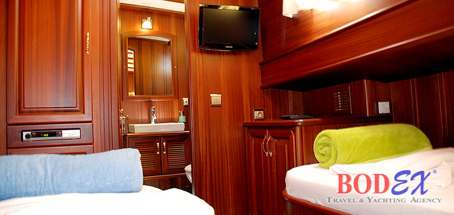 ..is a 6 star deluxe gulet built in Bodrum. It is 24 meters long and 6,30 meters wide. On the ship you have 2 Twin and 2 Double bed cabins with own toilet and shower. Of course, all cabins are air-conditioned (depending on the ship, the duration of the air-conditioning can change).